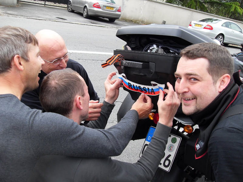 - Номера немецкие, а у замыкающего колонну во весь топкейс надпись «RUSSIA».